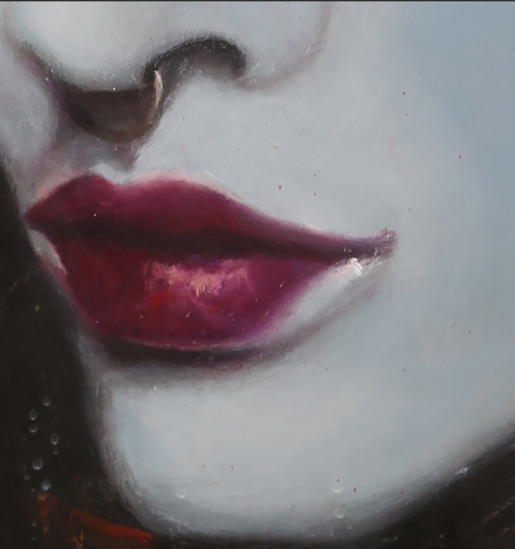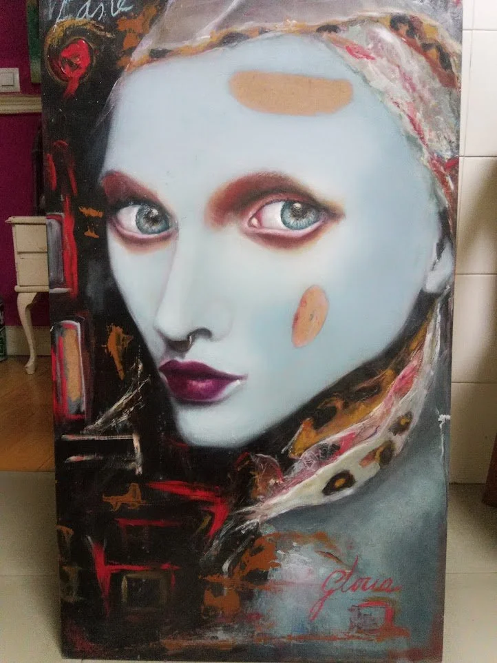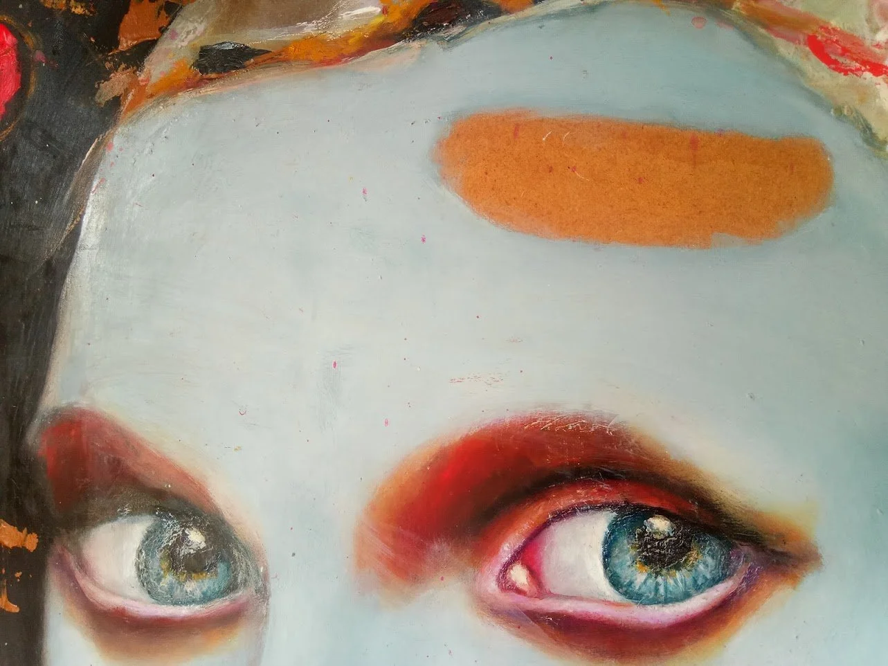 "Easte" is a captivating oil on board piece accentuated with ballpoint pen details, showcasing Gloria's experimental approach to mixed media. The ethereal pale tones of the figure's face contrast with the bold and vivid reds in the surrounding elements, creating a sense of otherworldliness.